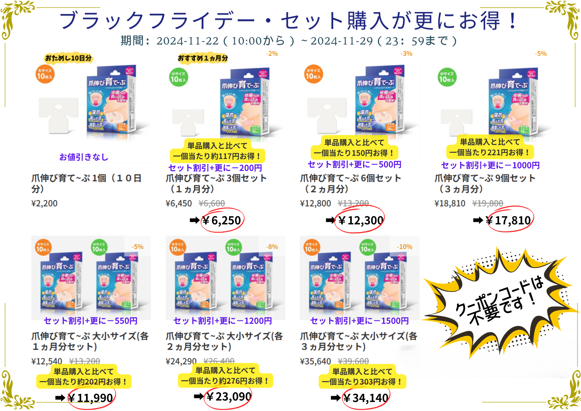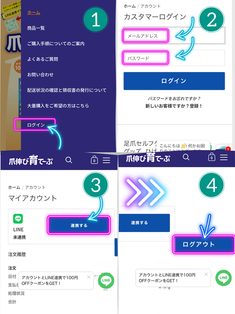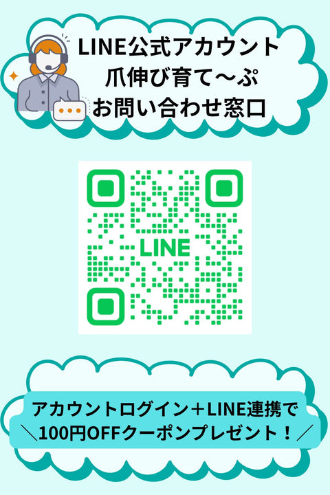 実はこのクーポン、以前から配布しているのですが、まだ知らない方も多いようです。LINE連携をしていただくだけで、100円OFFクーポンがすぐに取得できます! 手順はとても簡単で、ログイン後に「LINE連携」ボタンを押すだけ。初回購入時に自動作成されたアカウントでログインできるので、面倒な登録は不要です。 さらに、画像付きでわかりやすく解説したFAQも新たに追加しました。ログイン・ログアウトの方法も掲載していますので、ぜひご確認ください。 👉 よくあるご質問の「LINE連携で100円OFFクーポンを取得する手順」、もしくはチャットボットに”LINE連携”とご入力いただくとご覧になれます。 今後とも、爪伸び育て~ぷをよろしくお願いいたします。